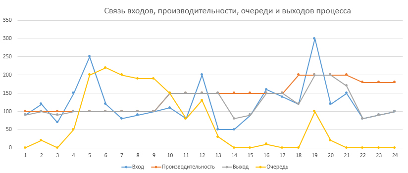 Рис.2. Пример связи входов, производительности, очереди и выходов процесса.