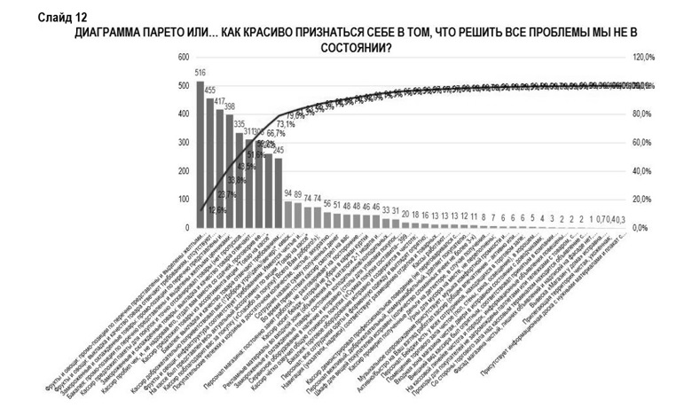 Так, бизнес-процесс “Управление трейд-маркетингом” сопряжен с типовым несоответствием “промо-товары отсутствуют и/или не выделены акционными ценниками”, поскольку именно в рамках этого процесса выполняется весь спектр работ с этим сегментом ассортимента компании, включая расстановку желтых ценников в магазинах. Значит, если ценников нет, проблема внутри этого и смежных с ним (закупки, логистика) процессов. Построим также диаграмму Парето (см. слайд 12) чтобы увидеть на ней только ранжировку всех типовых нарушений в привязке к ПЧР и ничего более.