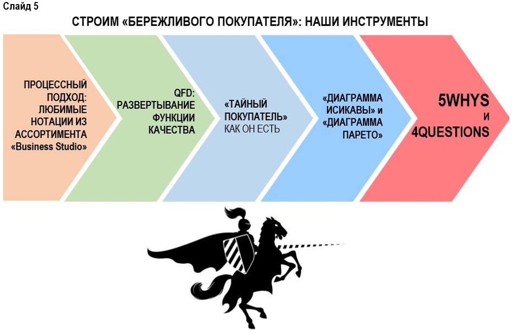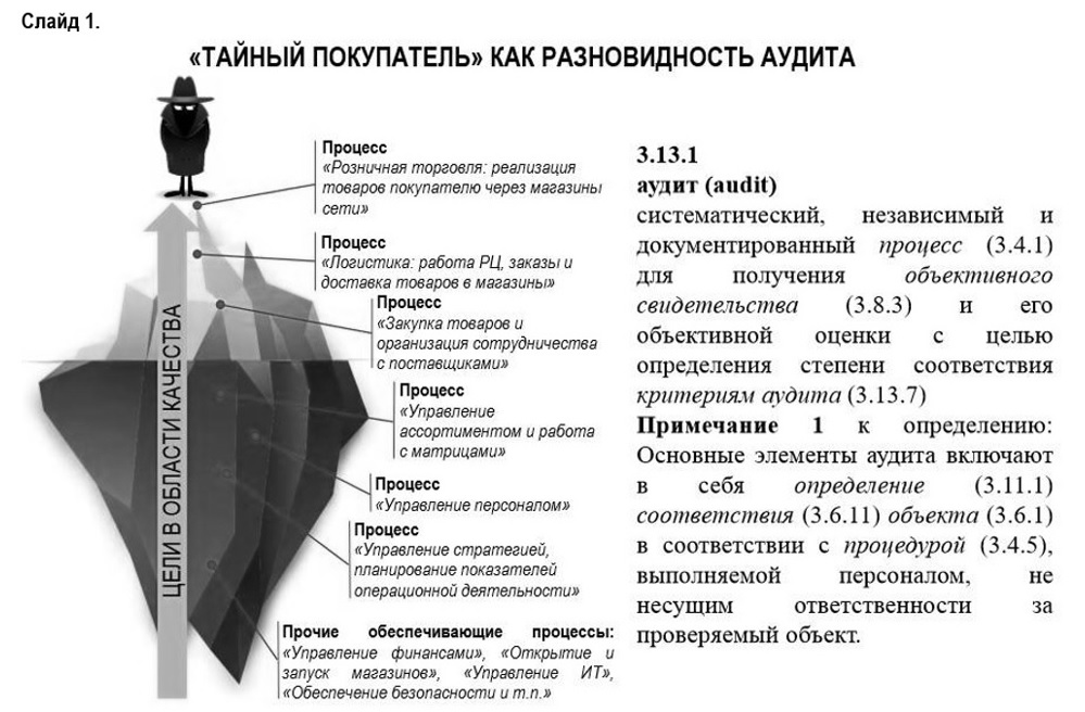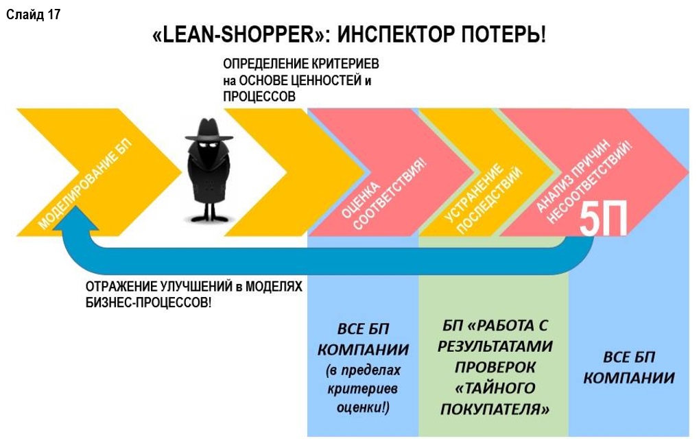 Я вижу совсем другого “Тайного Покупателя”! Того, который фиксирует первопричины всех недостатков компании, находясь на вершине ее системы процессов, и, через эффективный анализ несоответствий, помогает компании внести в свои процессы - в глубине ее системы управления - необходимые изменения. Того, который дает отсчет развертыванию длинных цепей причинно-следственных связей и инициирует глубинные изменения, потребность которых обосновывается проблемами со способностью компании удовлетворять требованиям своих покупателей. Совокупно, путь от традиционного “Тайного Покупателя”, оценивающего кассиров и уборщиц, до совершенно нового, “бережливого” и “глубинного”, выглядит так (см. слайд 5).