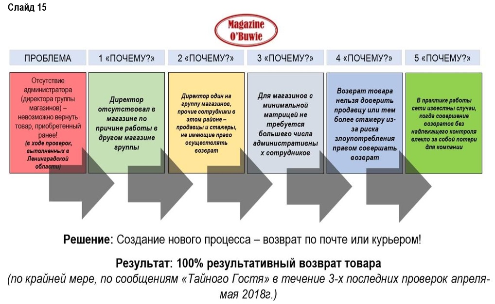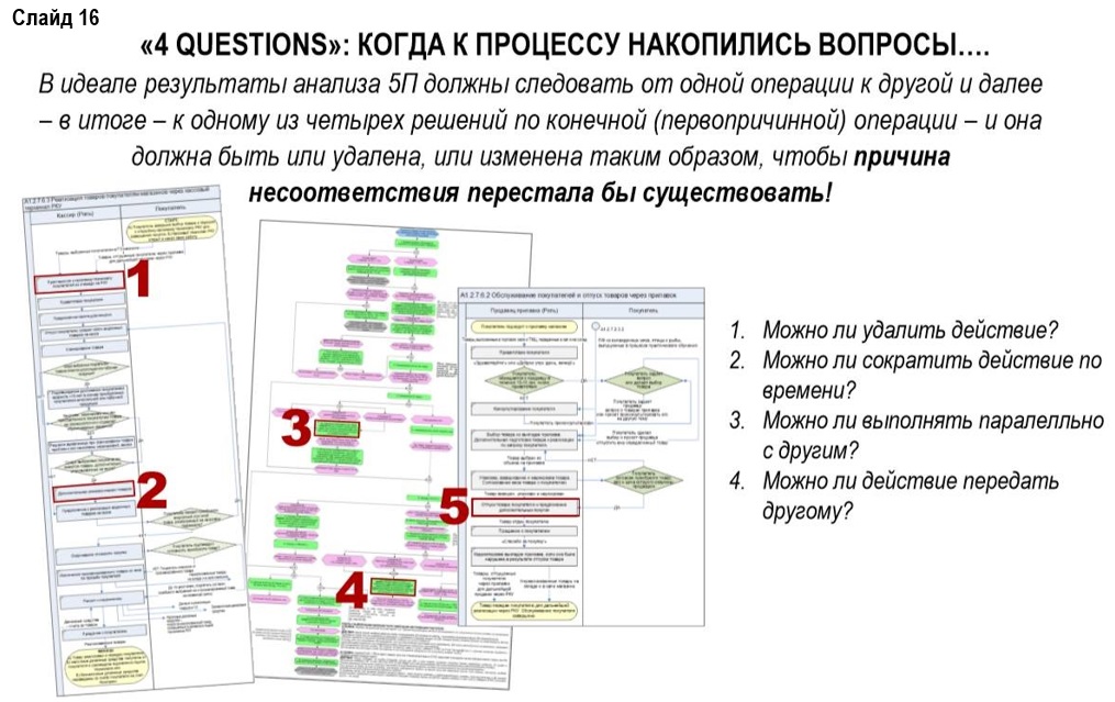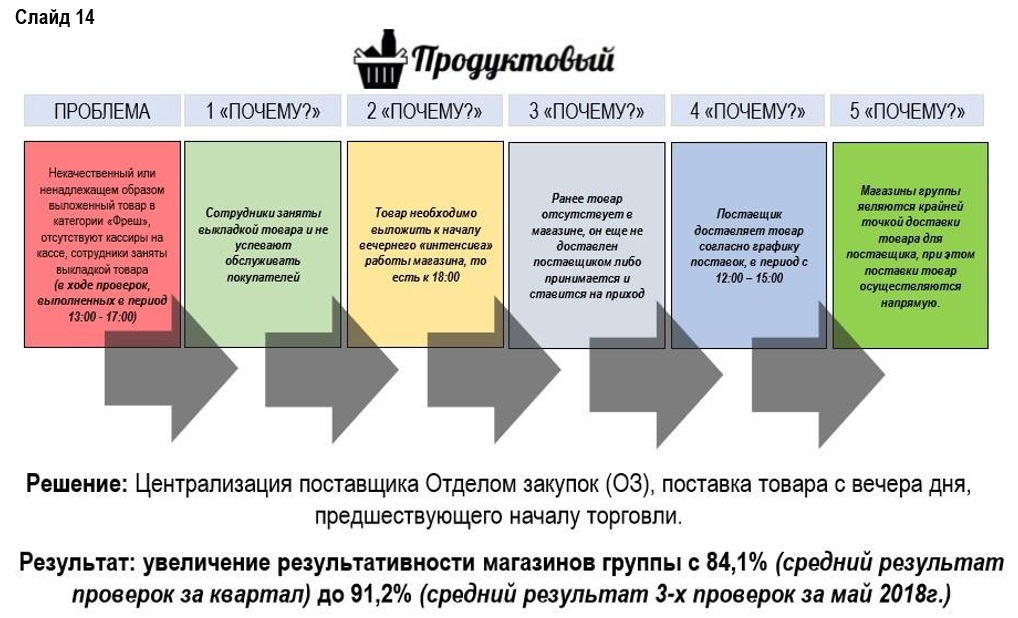 Для анализа причин несоответствий вы можете использовать различные инструменты, здесь важно качество самого анализа, а не конкретный выбор. Мы в рамках пилотного проекта на сессии с владельцами создающих стандарт сервиса (!) бизнес-процессов использовали 5WHYS, плавно переходящие в 4QUESTIONS. Спасибо замечательному эксперту по “русскому” “Бережливому Производству” Алексею Игнатюку за вдохновение этими инструментами! Результаты анализа причин можно увидеть на следующих слайдах (см. слайды 13, 14 и 15, 16). Слайды 13, 14, 15 и 16