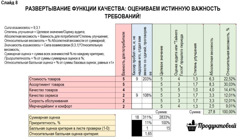 Обратите внимание, что важно покупателям в первую и вторую и третью очередь: совершенно не сервис. Не “здрасьте” кассира и не “чем я могу вам помочь” изможденной пожилой продавщицы, густо накрашенной дешевым кремом. Мы учтем эти приоритеты при определении критериев “Тайного Покупателя”. Что же, барабанная дробь: мы строим СКЛАД КАЧЕСТВА (упрощенный “Дом Качества” (QFD) с плоской современной крышей), в котором отвечаем на каждую ценность определенным набором критериев. Взгляните на фрагмент получившегося у меня “склада” на слайде 8.