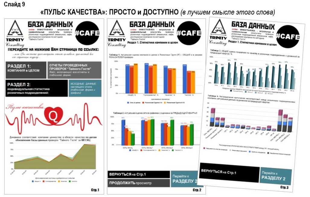 Что же, теперь самое время провести запланированные проверки. Чтобы обеспечить прослеживаемость их результатов в периода работы агентов, мы используем “Пульс Качества” - автоматизированный на уровне связей между таблицами Excel онлайн отчет, доступный каждому пользователю по ссылке на Google Drive. С помощью этого меню с любого устройства руководство розницы сможет отслеживать динамику выполняемых “Тайным Покупателем” проверок - в целом по компании, в разрезе групп магазинов или дивизионов или отдельных магазинов. Как угодно (см. слайд 9).