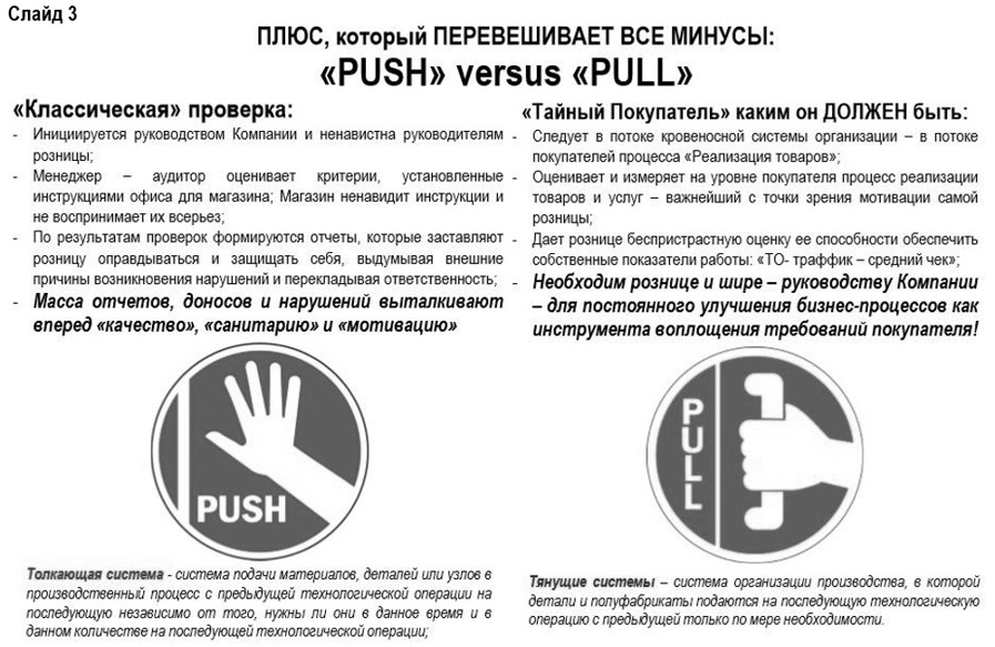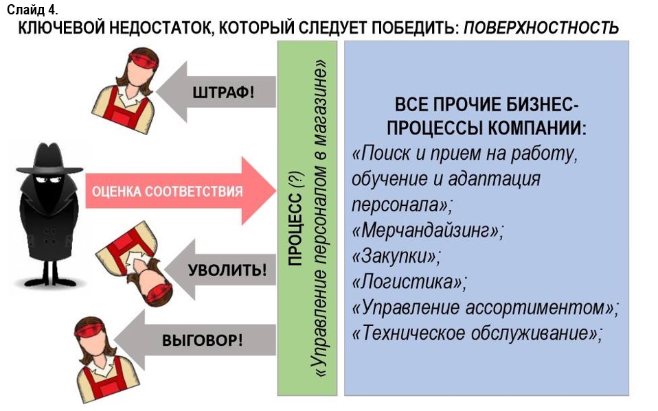 К сожалению, на практике “Тайный Покупатель” - в его традиционном облике - очень поверхностен и не изменяет процессы, а только немного влияет на судьбу неугодного администрации розницы персонала (см. слайд 4).