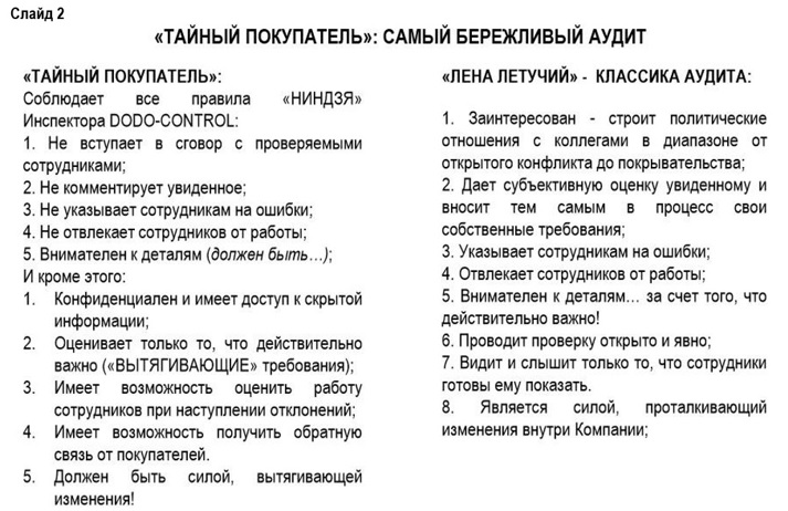 Для “Тайного Покупателя” характерны же следующие преимущества воистину “бережливого” вида аудитов, которые выгодно отличают его от “обычных” проверок в стиле “Лены Летучей” (см. слайд 2). Пожалуй, на этом слайде во время конференции мне следовало остановиться подольше, поскольку приведенное здесь сравнение важно.