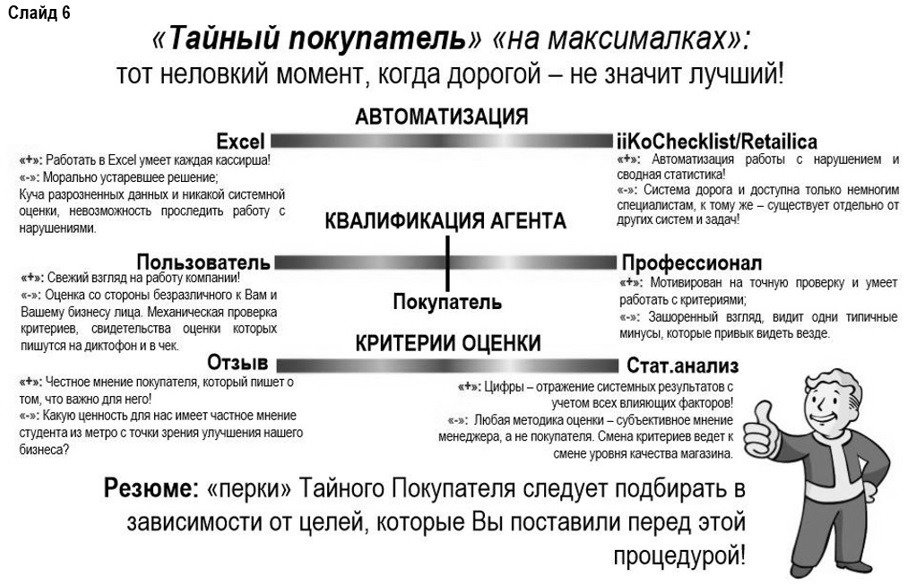 Говорить об описании бизнес-процессов я не стану: они безусловно необходимы, если Вы ставите перед собой цель улучшить сами процессы. Это некая база и основа, без которой добиться успеха в определении и анализе нарушений с помощью “Тайного Покупателя” будет значительно сложнее. Но мы, пожалуй, начнем с того, что определимся с техническими характеристиками желанного для нас “Покупателя” (см. слайд 6).