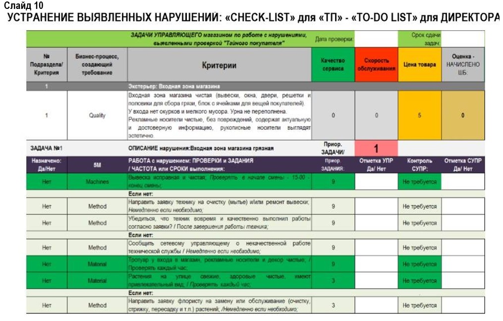 Таким образом, мы отдаем в розницу не перечень ее несчастий и неприятностей (по крайней мере, не только его), а еще и одновременно - руководство по устранению выявленных нарушений. С помощью которого мы еще и обучаем сотрудников действующим внутренним процедурам компании, выполнение требований которых как раз и должно позволить магазину избавиться от показанных “Покупателем” нарушений. Не правда ли, звучит амбициозно?