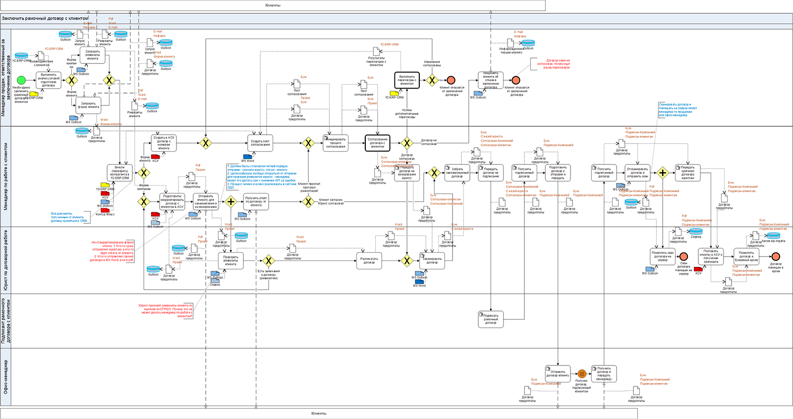 - отсутствие четкого бизнес-правила по отправке проекта договора клиенту (что сначала: проверка у юриста или отправка документа клиенту).