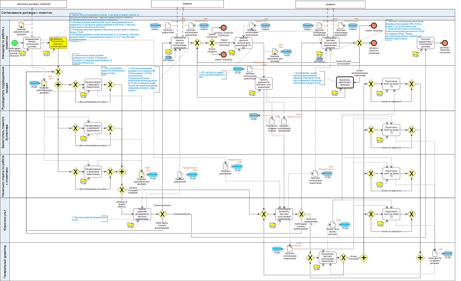 Рис. 2. Модель бизнес-процесса согласования договора с клиентом «As is».