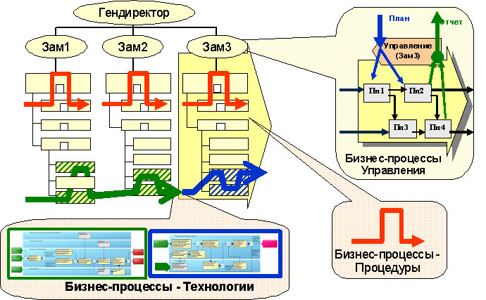 - процессы управляют крупными объектами или совокупностями крупных объектов (блоками, направлениями деятельности, филиалами, всей компанией и т.д.);