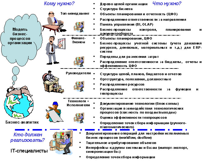 Тем не менее, руководствуясь таким переводом, сотрудники ИТ-сервисов начинают руководить проектом по созданию модели бизнеса. То есть, объекты управления в организации выделяют и описывают не профессиональные менеджеры, а IT-специалисты, просто потому, что они лучше знают «птичьи языки» моделирования и программирования.