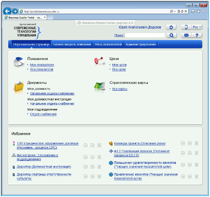 После авторизации на портале сотрудник попадает на свою Персональную страницу. На ней собраны все необходимые ссылки для быстрого перехода к нужной информации и документам: «Описание должности», «Должностная инструкция», «Описание подразделения сотрудника» и другие отчеты. Набор ссылок на персональной странице можно настраивать под нужды компании, также и каждый сотрудник может формировать свой собственный раздел "Избранное".