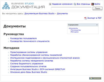 Впервые за всю историю Business Studio вся необходимая информация по использованию системы предоставлена пользователям в максимально удобном виде онлайн-справки. Для размещения справки в Интернете был использован Wiki-подобный движок. Теперь не нужно обращаться ни к каким бумажным инструкциям – всё стало доступно сразу из программы: в нужном месте представлена необходимая контекстная помощь. Справка может размещаться и локально: при вызове Business Studio осуществляется настройка направления запроса – на компьютер пользователя или на сайт http://wiki.businessstudio.ru