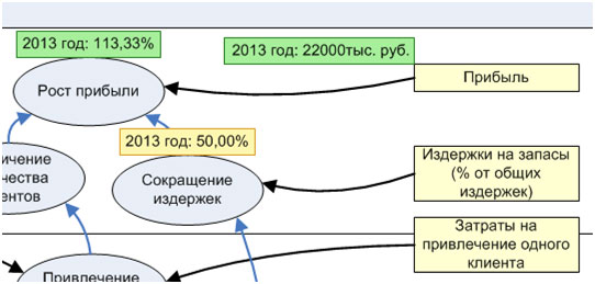 Аналогичным образом контролируется и достижение целей компании. Оценка достижения целей рассчитывается автоматически на основе значений показателей, привязанных к ней. Также можно осуществлять контроль достижения сразу всех целей с помощью стратегической карты.