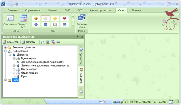 В новой версии Business Studio впервые появилась возможность выбора темы оформления. Теперь пользователь сам решает, в какой цветовой гамме он предпочитает видеть интерфейс программы – возможны порядка 40 вариантов: от стандартной цветовой схемы, приближенной к стандартам web 2.0 для дизайна, до забавных «Зимней» темы или темы «Валентинка».