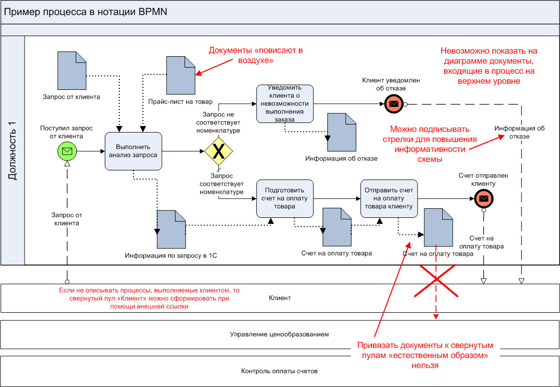 Обратите внимание на документ «Запрос от клиента», показанный в левом верхнем углу схемы рис. 1. Этот документ «повис в воздухе». В нотации BPMN2.0 не предусмотрена возможность моделирования информационных (материальных) потоков между пулами.
