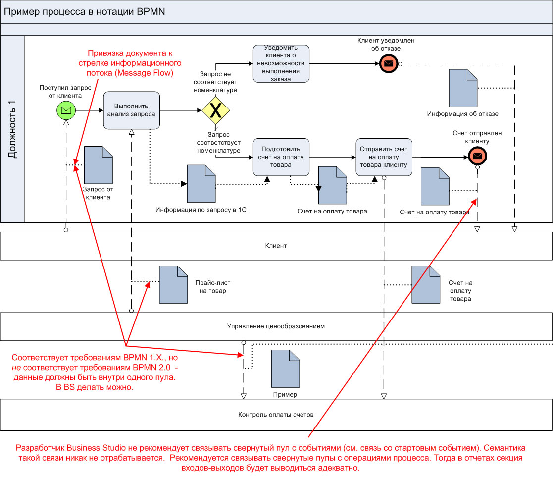 Подчеркнем, что в функциональные возможности BusinessStudio позволяют моделировать связи, показанные на рис. 2. (см. поток с привязанным документом «Пример», связывающий два свернутых пула «Управление ценообразованием» и «Контроль оплаты счетов»), но это является нарушением нотации BPMN 2.0. Однако, такое нарушение не является критичным. Главное четко оговорить ситуацию во внутреннем стандарте компании, определяющем правила моделирования процессов в BusinessStudio.