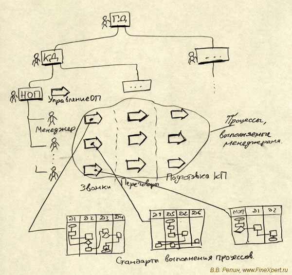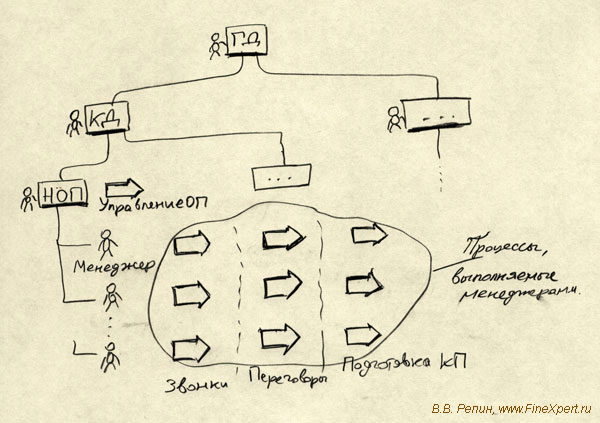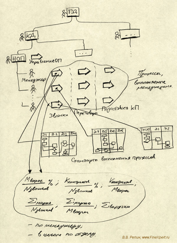 Таким образом, реальные объекты управления – это деятельность как каждого менеджера ОП в отдельности, так и отдела ОП в целом. Важно оценивать и анализировать результативность и эффективность работы каждого менеджера в отдельности. Потом принимать управленческие решения – менять менеджеров, менять систему мотивации, менять стандарты работы (те самые схемы бизнес-процессов!), менять оборудование (телефоны, РС и т.п.), менять программное обеспечение и т.п.