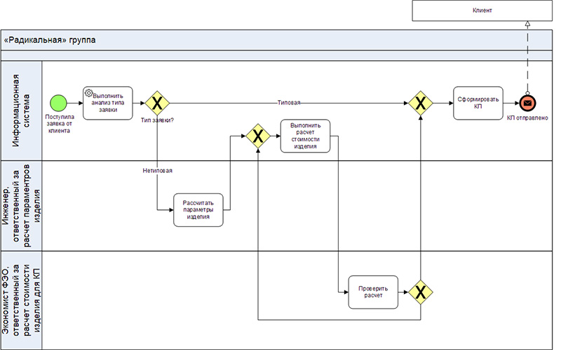 На рис. 1 представлена исходная схема процесса «Формирование КП клиенту». КП – коммерческое предложение. Речь идет о торгово-производственной компании B2B, которая выпускает стандартный ассортимент, но может по требованию заказчиков вносить конструктивные изменения в модели изделий, использовать другие материалы, цвета и т.п.