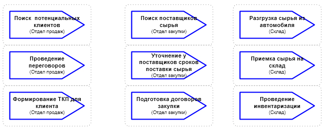 Для игры используются заранее заготовленные карточки с бизнес-процессами некоторой компании. По условиям задачи эта организация производит и продает оптом чайники.