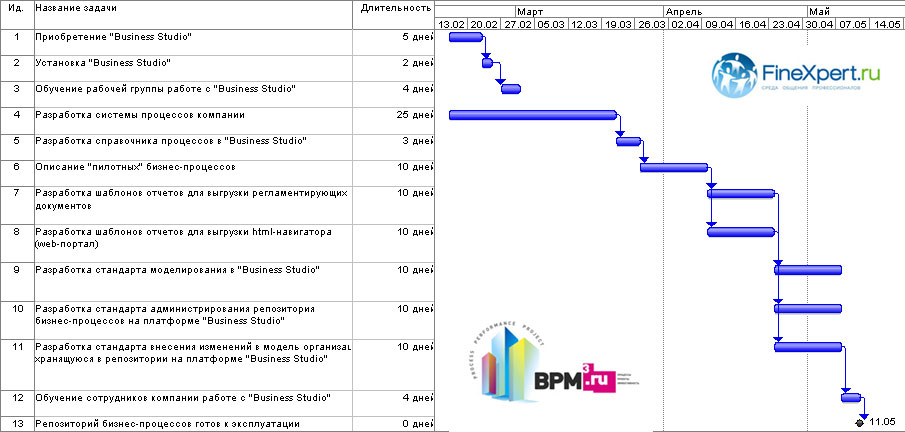 В последнее время стало модно использовать термин «дорожная карта». Но мы просто нарисуем график Ганта проекта по созданию электронного репозитория бизнес-процессов на платформе «Business Studio».