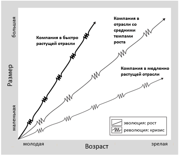 Скорость, с которой организация проходит периоды эволюций и революций, тесно связана с рыночной динамикой ее отрасли. Компании на быстро расширяющемся рынке необходимо быстро увеличивать штат сотрудников; следовательно, потребность в срочном создании новых организационных структур для размещения большого количества нанимаемого персонала возрастает. Если эволюционные периоды в быстрорастущих отраслях, как правило, относительно коротки, то в зрелых или медленно растущих отраслях они гораздо более продолжительны.