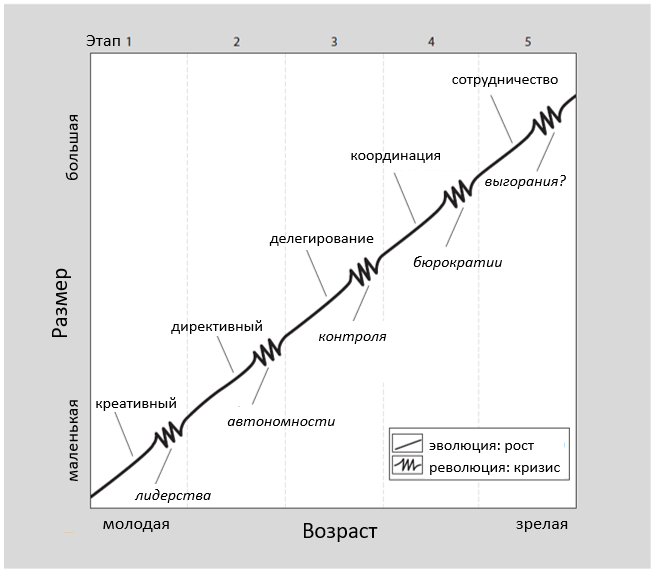 Вертикальная ось на графике показывает размер компании.С ростом численности сотрудников и объема продаж, как правило, заметно меняются проблемы компании и способы их решения. Усиливаются проблемы координации и коммуникаций, появляются новые функции, множатся уровни иерархии управления, должности все сильнее пересекаются. Таким образом, время не является единственным определяющим фактором – в компании, размер которой не увеличивается, управленческие проблемы и используемые методы могут оставаться неизменными в течение длительного периода.