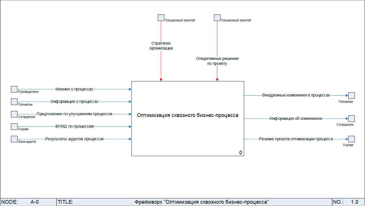 Процессный Фреймворк был разработан в нотациях IDEF0 и BPMN в Business Studio 5. На рис. 1 представлена его контекстная диаграмма. Ключевыми входами в процесс являются: стратегия организации, мнения руководителей и специалистов, предложения сотрудников, результаты аудитов и, конечно, информация о выполнении процессов «Как есть». Ключевые выходы: внедренные изменения, информация об изменениях для сотрудников компании, информация о проекте («Резюме проекта») в базе знаний организации (на внутреннем портале).