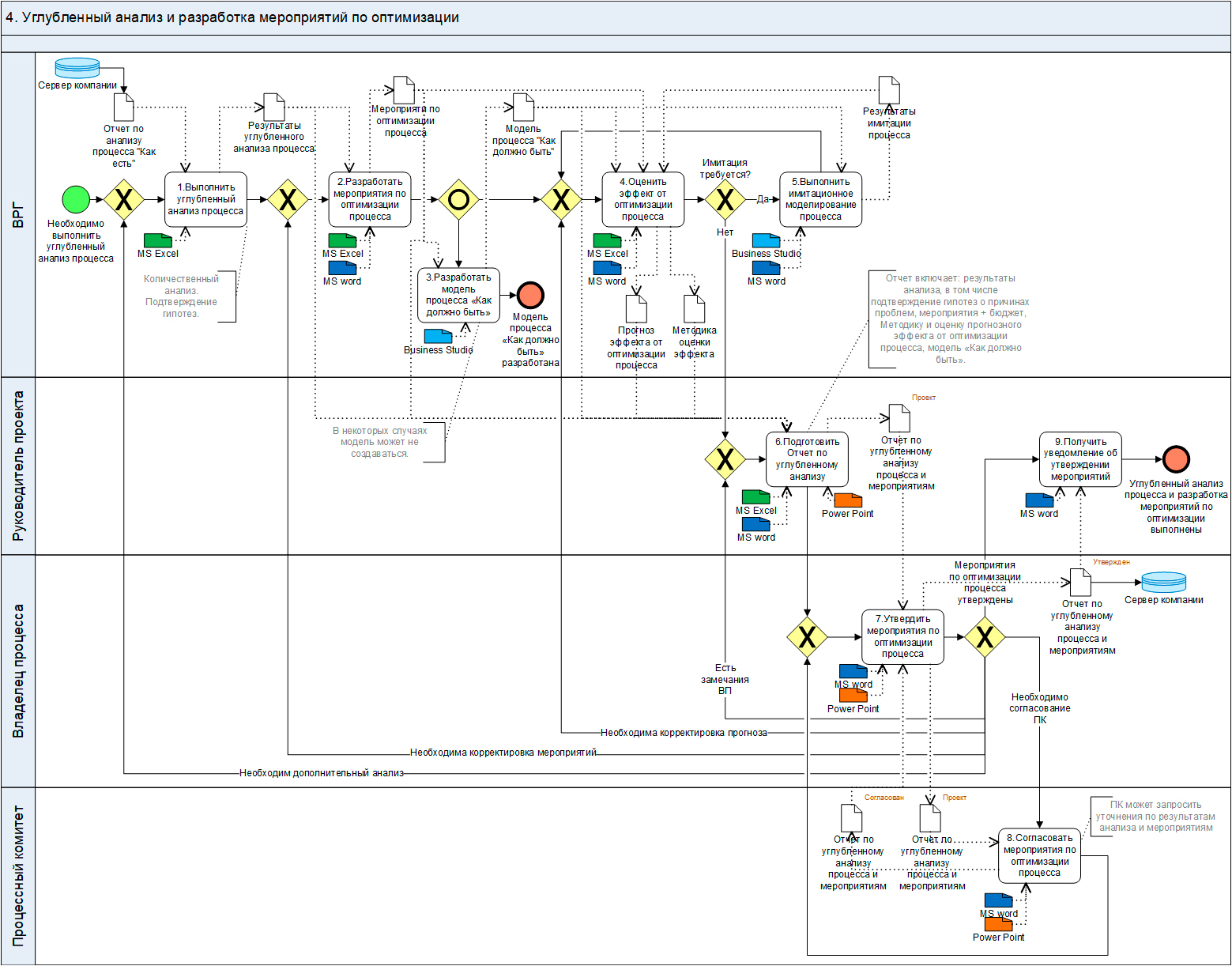 Углубленный анализ и разработка мероприятий по оптимизации – ключевой этап проекта, в рамках которого проводится глубокий анализ процесса, подтверждаются (опровергаются) гипотезы о причинах проблем, разрабатываются мероприятия по оптимизации процесса, разрабатывается методика оценки эффекта, оценивается прогнозный эффект от оптимизации процесса, принимаются решения о внедрении соответствующих мероприятий (включая бюджет).