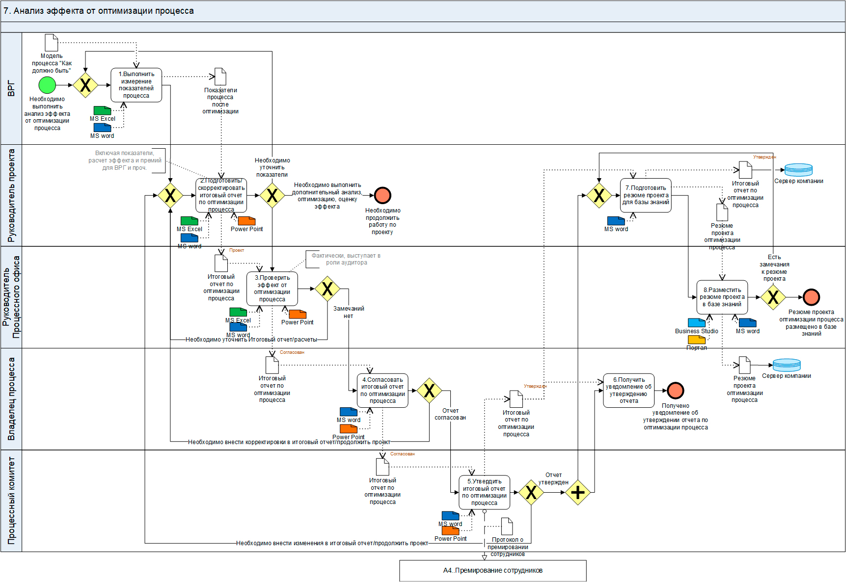 После того, как ВРГ рассчитает показатели процесса, Руководитель проекта готовит Итоговый Отчет по оптимизации сквозного бизнес-процесса, который включает в том числе оценку эффекта от оптимизации и предложения по премированию участников проекта (ВРГ, Руководителя проекта, Владельца процесса и проч.).