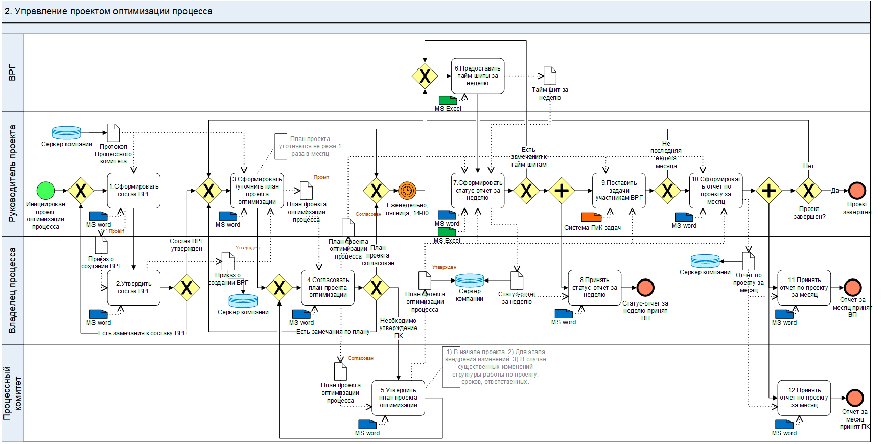 Управление проектом оптимизации процесса – это, по сути, довольно формальная, но очень важная деятельность по администрированию проекта, в первую очередь, - контроль деятельности временной рабочей группы (групп) и обеспечение соблюдения сроков выполнения работ и качества ее результатов. Все содержательные работы, например, подготовка Отчетов по результатам анализа процессов или внедрения изменений, в которых участвует руководитель проекта, вынесены в другие процессы Фреймворка.
