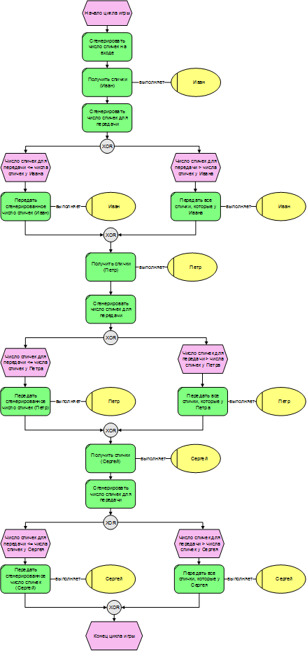 Модель процесса игры, разработанная в нотации ARIS eEPC, представлена на рис. 1. В игре Голдрата принимали участие пять мальчиков. Я сократил число участников игры до 3-х человек, поскольку это не принципиально. Играть будут: Иван, Петр, Сергей.