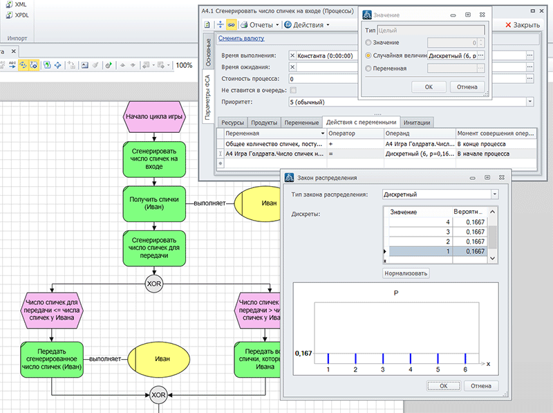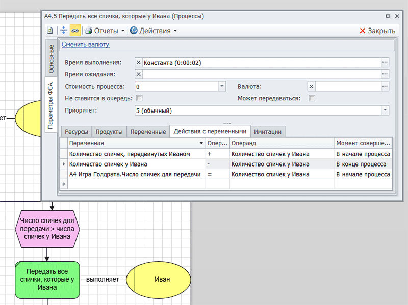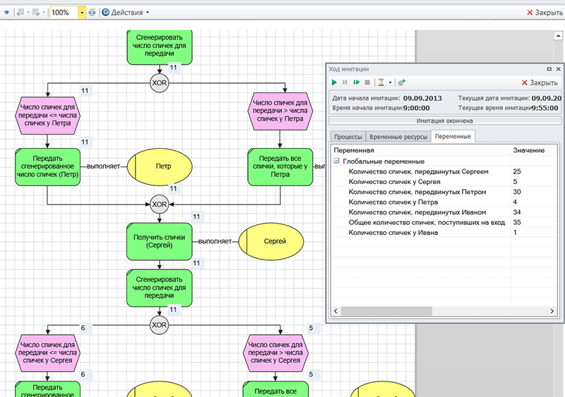 В начале процесса автоматически генерируется число спичек, которые получает Иван. Затем генерируется число спичек для передачи и т.д.
