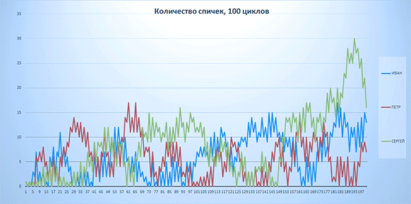 Итак, запускаем 100 циклов игры и получаем следующий результат: