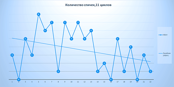 Рис. 5-2. Количество спичек у Ивана. 11 циклов игры.