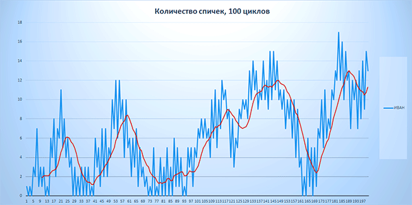 Рис. 6-2. Количество спичек у Ивана. 100 циклов игры.