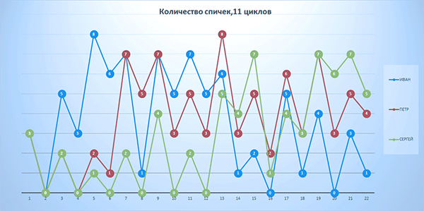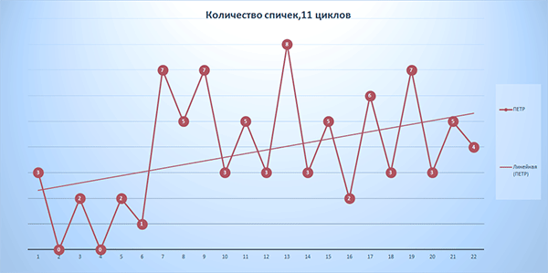 Рис. 5-3 Количество спичек у Петра. 11 циклов игры.