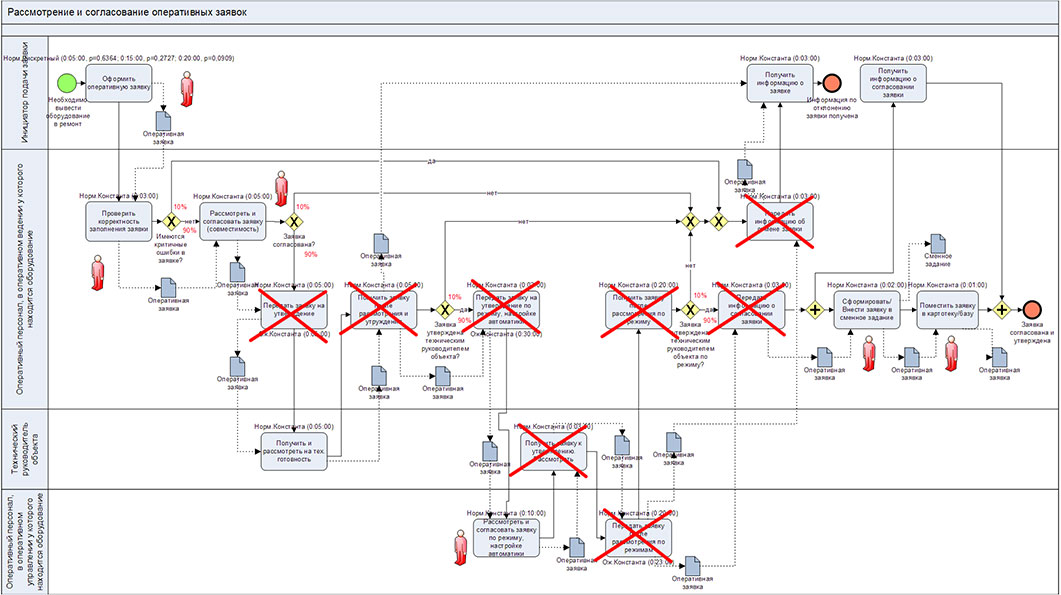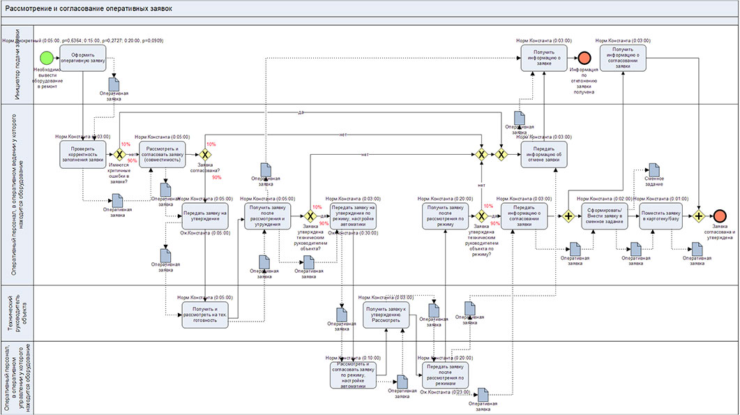 На схеме процесса показано время выполнения каждой операции. Например, для операции «Рассмотреть и согласовать заявку (совместимость)» сверху указано «Норм.Константа (0:05:00)». Это означает, что нормативное время выполнения данной операции составляет 5 минут. Там, где снизу операции написано «Ож.Константа…» это означает время ожидания выполнения из-за, например, отсутствия ресурса и проч.