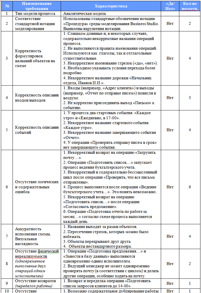 Это самый важный раздел в чек-листе. В первую очередь, здесь нужно указать логические ошибки. Например, некорректное использование в паре логических операторов «И» и «ИЛИ». Но главное, это содержательный анализ схемы. Необходимо продумать, как будет выполняться процесс, если следовать строго по его графической схеме. Насколько он будет выполним, результативен и эффективен. При проведении содержательного анализа схемы целесообразно привлечь эксперта по предметной области (узкоспециализированный отраслевой специалист).
