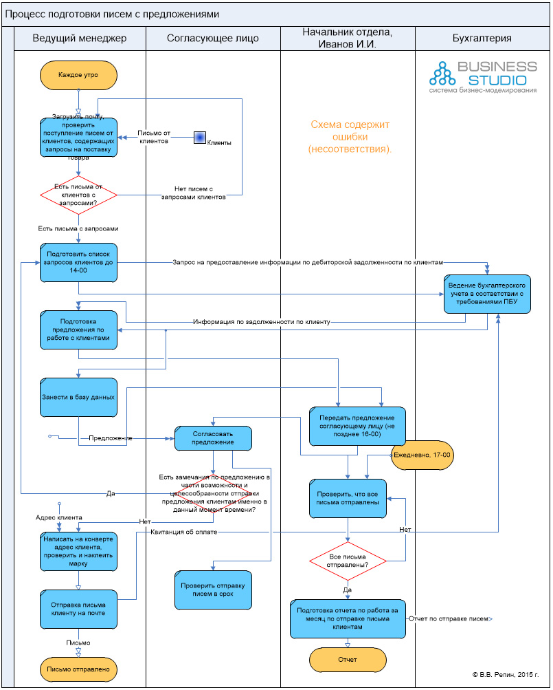 Ниже представлена графическая схема бизнес-процесса, разрабатывая которую я попытался допустить все описанные выше ошибки (несоответствия). После схемы приводится чек-лист. Рекомендую сначала попробовать найти несоответствия в схеме самостоятельно, а уже потом посмотреть мой вариант чек-листа.