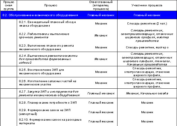 Показанные в таб. 3. процессы практически все выполняются в Отделе главного механика. Только несколько процессов связаны с межфункциональным взаимодействием, например это процесс «8.2.7. Закупка ЗИП и инструмента для ремонта механического оборудования».