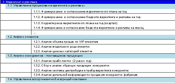 Что же представляет собой (система) процессов компании? Как правило, это иерархический справочник процессов следующего вида:
