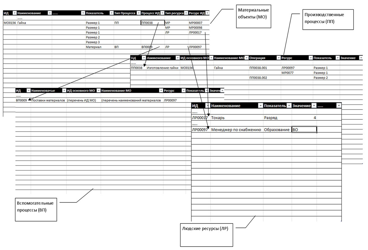 То же касается объектов и ресурсов. Скажем неисправность оборудования или отклонения в свойствах материала тоже может быть отслежена по цепочке причинно-следственных связей. В качестве примера могу привести предполагаемую структуру таблиц свойств и зависимостей для материального объекта – ну той же гайки например.