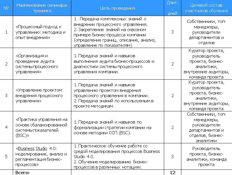 Одним из способов быстро консолидировать представления о процессном управлении и получить «союзников» при внедрении, является проведение корпоративных семинаров-тренингов.