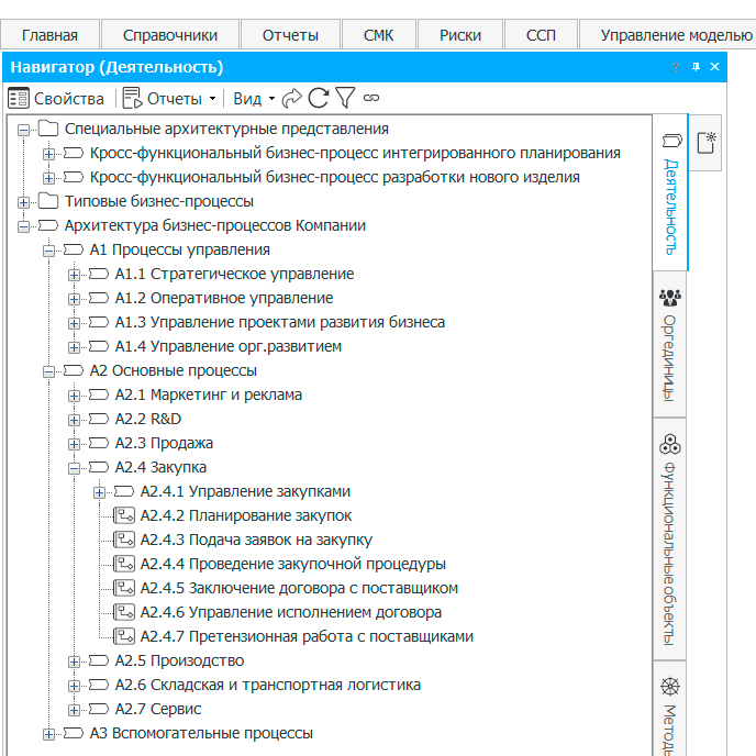 На рис. 2 представлен пример верхнего уровня архитектуры бизнес-процессов (категории бизнес-процессов), выполненный в нотации IDEF0 в программном продукте Business Studio.