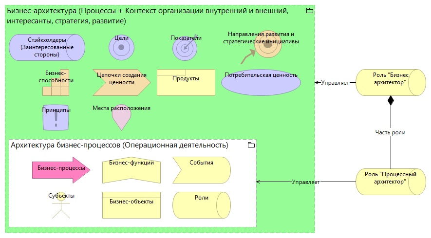 Архитектура бизнес-процессов включает в себя не только процессы, но и информацию об организационной и ролевой структуре, системах бизнес-правил и документов компании и прочее. Процессная архитектура – это важнейшая, фундаментальная часть корпоративной архитектуры организации. Заметим, что корпоративная архитектура в целом может быть построена с использованием стандарта Archimate.