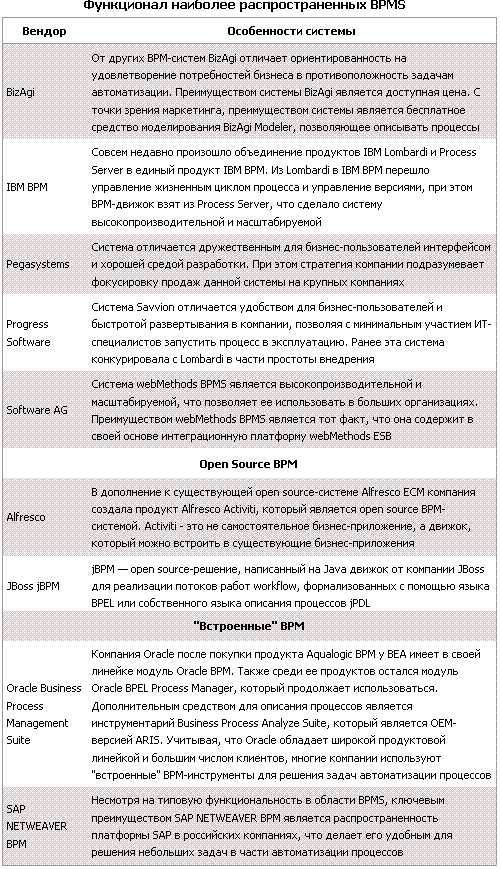 По данным аналитической компании Forrester Research, основной интерес к BPMS на мировом уровне наблюдается в банковском и страховом секторах, сервисных компаниях, производстве, государстве и здравоохранении, розничной торговле, энергетике и телекоммуникациях. В России есть своя специфика, здесь BPMS в основном используется лишь в банках и страховых компаниях, а также в телекоме. Учитывая серьезный интерес к этому типу систем, многие вендоры добавили за последние несколько лет в свои продуктовые портфели BPM-решения путем покупки или собственной разработки. На российском рынке в нескольких компаниях используют систему K2. Система Ultimus BPMS имеет несколько внедрений, хотя ее активное продвижение на территории РФ было свернуто после покупки компанией Software AG компании IDS Scheer. Легкая BPM система BizAgi уже больше года продвигается на российском рынке, однако о законченных проектах пока не объявлялось. Присутствуют на в этом секторе и open-source BPM-системы: Alfresco (Activiti) и JBoss jBPM. Если говорить о распространенности, то наибольший вес среди внедренных BPMS безусловно за продуктами IBM (Lombardy и Process Server). Однако появляются новые компании и продукты, некоторые вендоры разрабатывают модули BPM на базе существующей платформы, а другие расширяют функциональность своей системы путем приобретения компаний-разработчиков BPM. При выборе стоит руководствоваться не громким именем производителя, а потребностями собственного бизнеса и направлением деятельности. Часто системы с меньшей функциональностью имеют удачные решения для определенных сфер деятельности.
