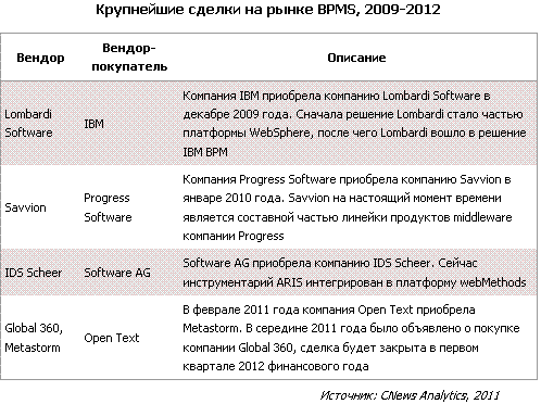 Рынок BPM фактически не пострадал во время экономического спада последних лет. Это является следствием того, что применение данной методологии и соответствующего инструментария повышает операционную эффективность ключевых бизнес-процессов, что в свою очередь позволяет усилить позиции в конкурентной борьбе.