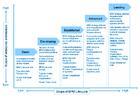 Четко изложенный стратегический план по управлению бизнес-процессами – разработка и внедрение бизнес-процессов в рамках широкомасштабных преобразований на предприятии имеет устойчивое воздействие на способ осуществления бизнеса. Строгость мер и нормы такой работы отражают зрелость организации на данный момент с учетом ее процессов и видения на будущее. На рисунке изображена модель зрелости, помогающая понять «где мы находимся» и «где мы хотим находиться». Часто организации обладают слишком амбициозным видением в области управления бизнес-процессами и не осознают качественный скачок в производительности, к которому стремятся, и в результате процессы «не способны» поддерживать это видение.