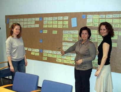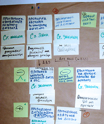 При описании подпроцесса используется любопытная технология визуализации. На большие листы упаковочной бумаги, прикрепленные в доске, последовательно наклеивают липкие листочки разного цвета. Светлые (белые) листки используются для описания операций, исполнителей и событий.