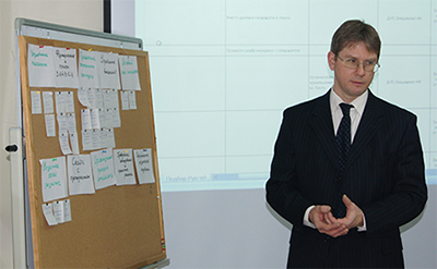 В декабре 2012 года на конференции «ПРОЦЕССНОЕ УПРАВЛЕНИЕ: сегодня и завтра» я прослушал весьма интересный доклад Наталии Самариной, Начальника отдела организационного развития ЗАО «ЮИТ Санкт-Петербург». В рамках доклада приводилась информация о методе описания процессов, используемом ООР в «ЮИТ». Это была так называемая «Моделирующая сессия» - совещание по структурированию процессов с привлечением руководителей и специалистов подразделений (см. рис. 1 – фото из опубликованного доклада).